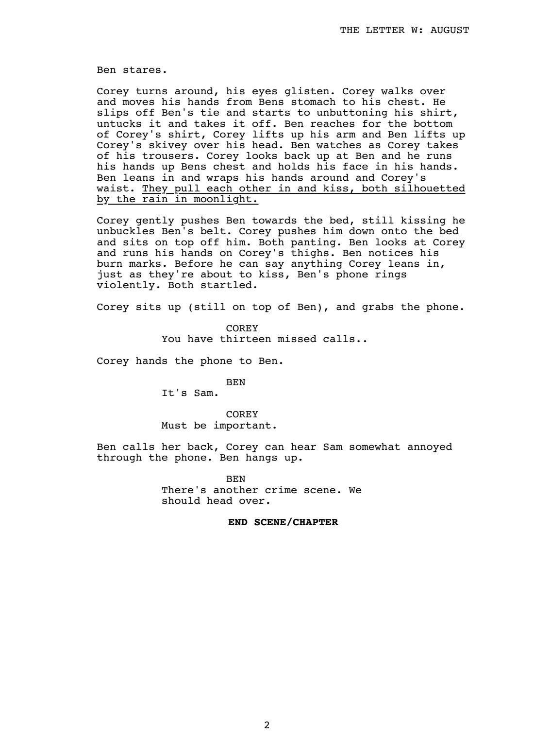 It’s focused on solving a string of murders, but also focuses on the detectives past. There’s a smidge of romance but it’s not the main focus, mainly cause I had a scene I really wanted to write out lol.