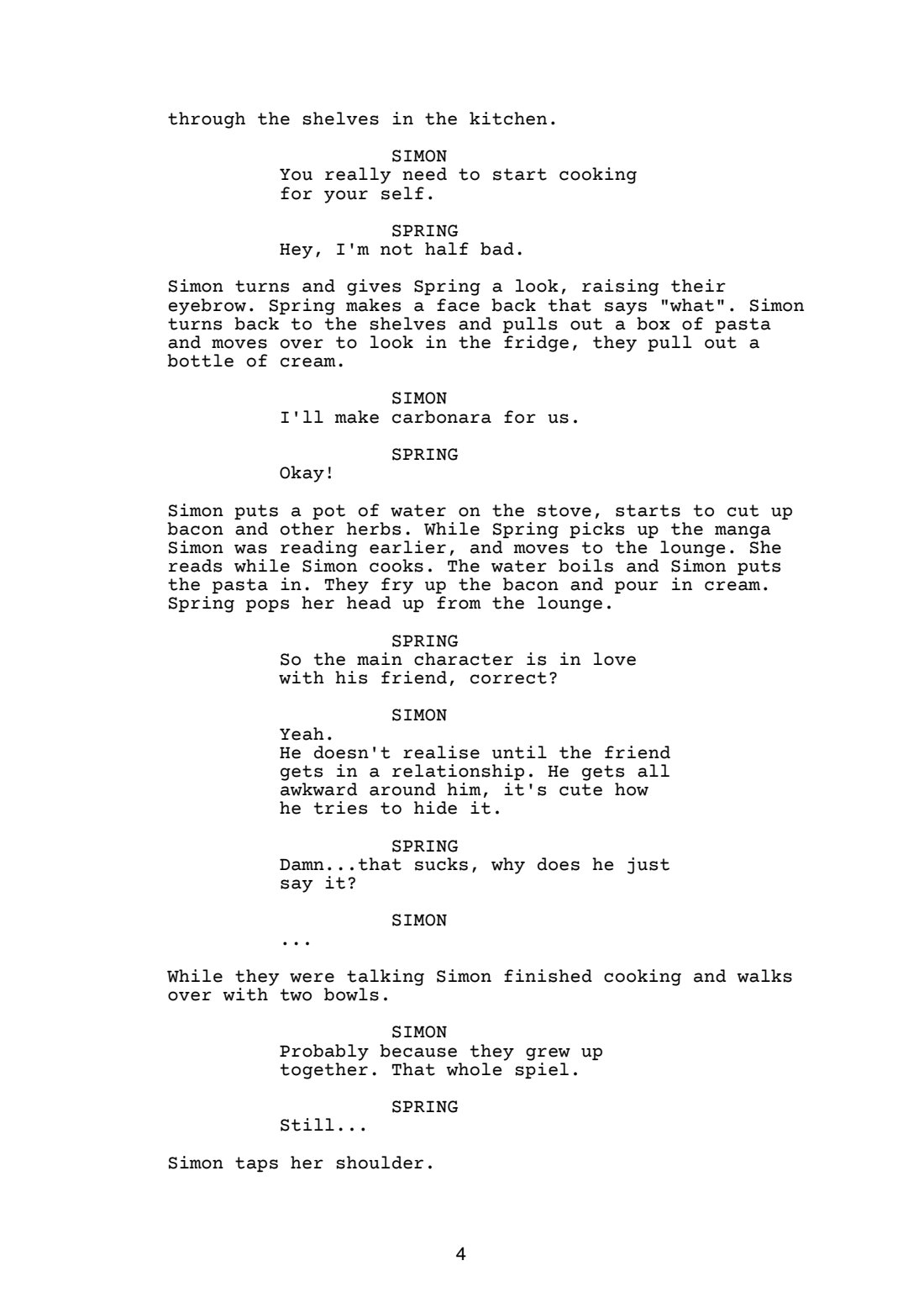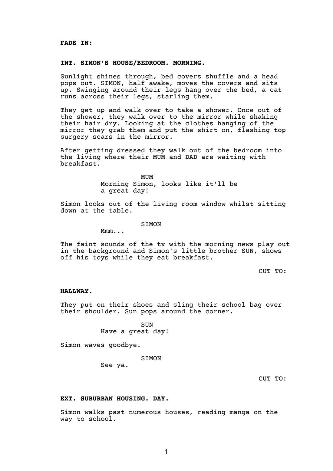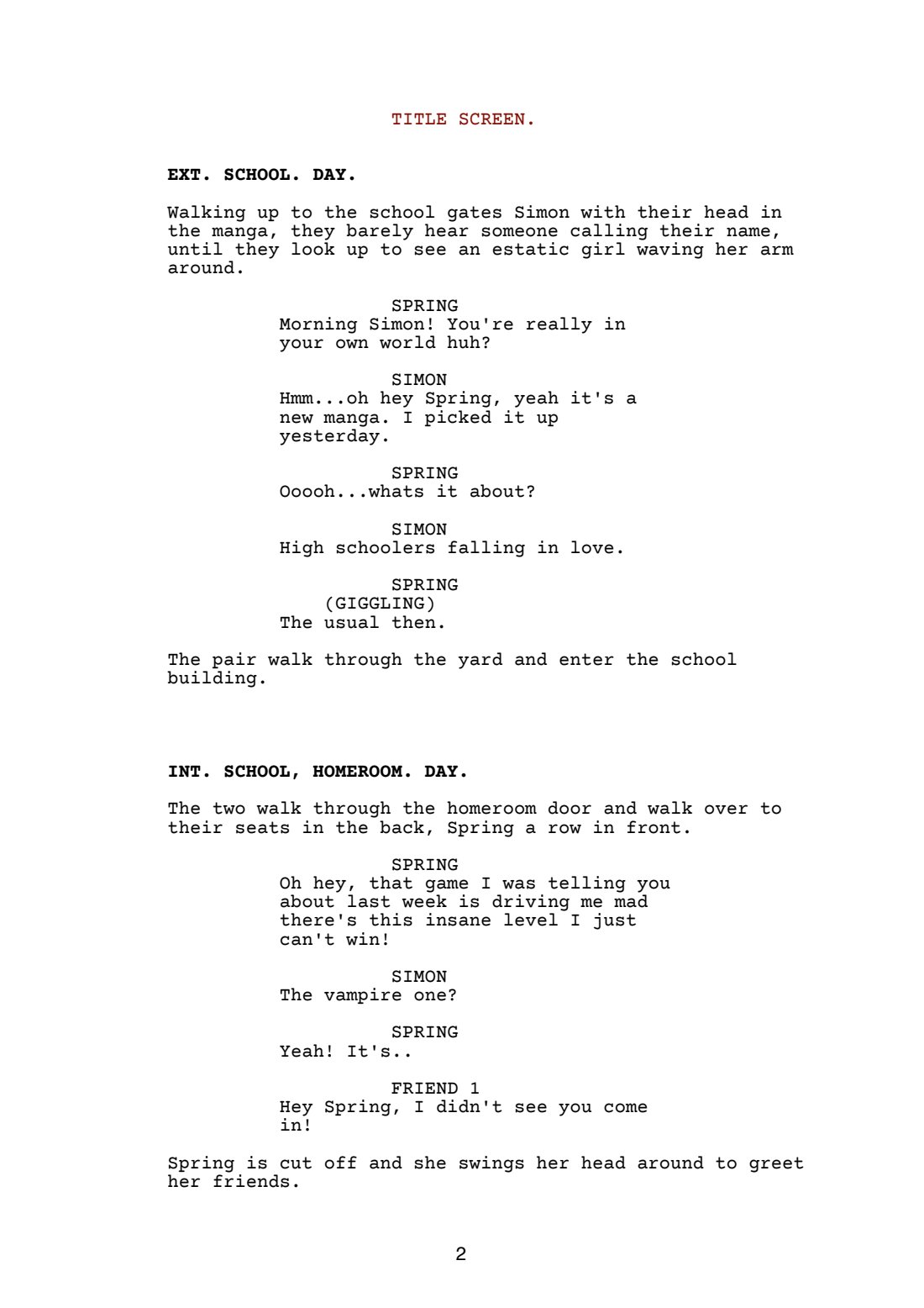 A short script intended for animation. An LGBTQ+ love story between two high school students. Simon is Trans/Non-Binary, not everyone accepts it but one person, Spring. Simon’s best friend since primary school, Simon is deeply in love with Spring. Through all the troubles Simon goes through, being in love is one of them, will they ever tell Spring how they feel?